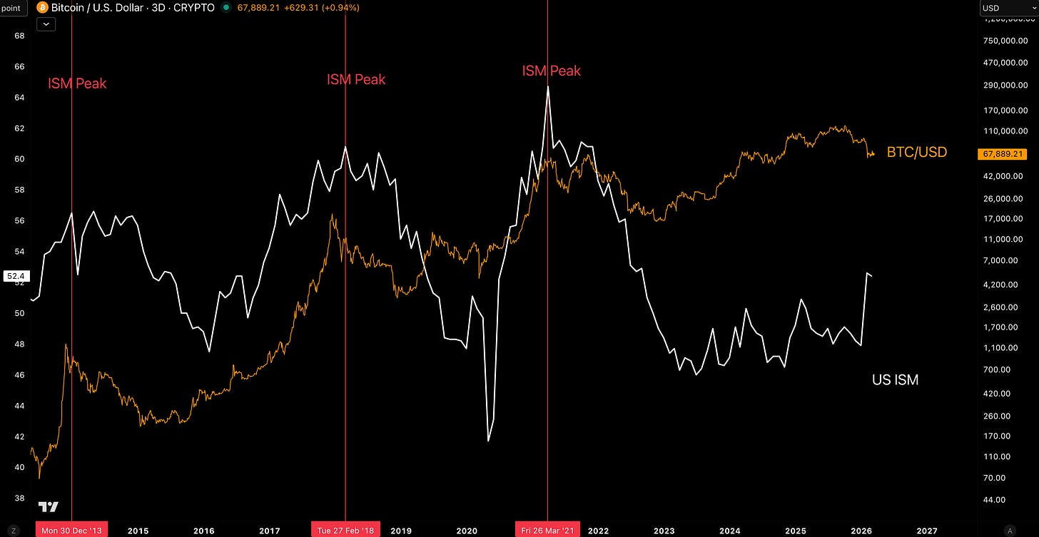 US ISM vs. BTC/USD. BTC typically peaks when US ISM is peaking >55-60+.