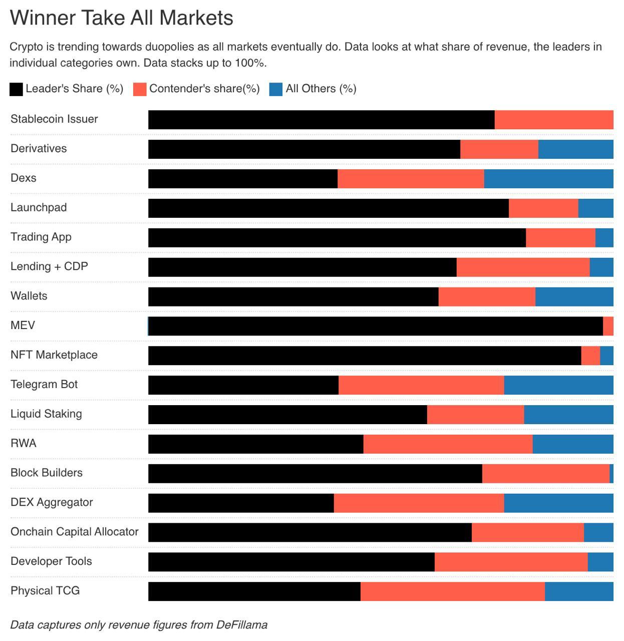 Data from DeFiLlama indicates that crypto markets are consolidating into duopolistic structures, with the top two players in each sector capturing roughly 80% of total revenue across the 15 major categories.