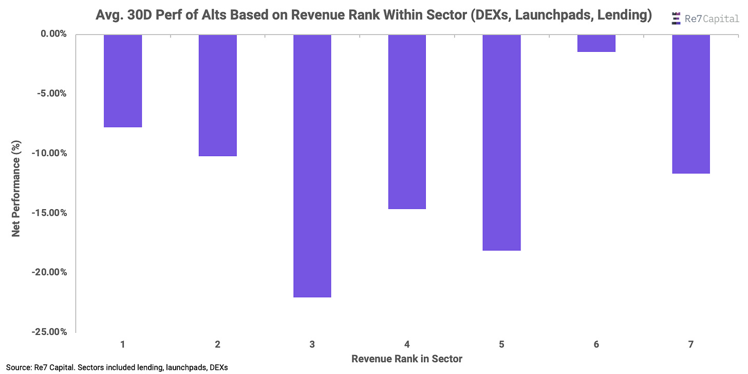 Building out this analysis further, we can see if the dominance of the top two revenue generators in each sector—e.g. DEXs, launchpads, and lending—has any relationship to the net performance of assets.