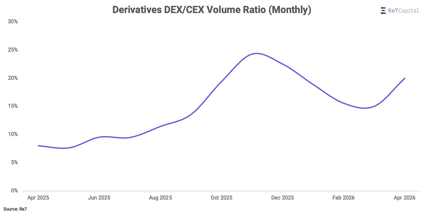 Today, 20% of derivative CEX volume is now being generated on-chain, up from 8% just 12 months ago (2x).