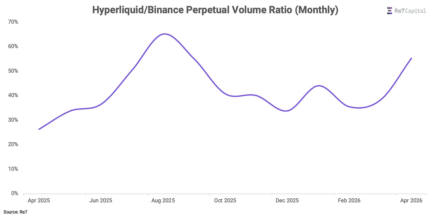 Binance remains the dominant CEX in perpetuals, but the gap with the leading DEX is closing fast. Twelve months ago, that venue was doing around 25% of Binance’s perp volume. It’s now at 55% — 2x in relative terms in a single year.