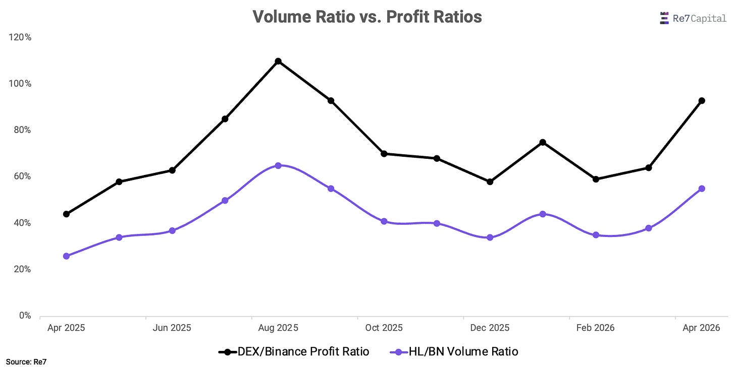 The chart below plots two lines against Binance: a volume ratio, and an implied profit ratio. The gap between them is the structural point.