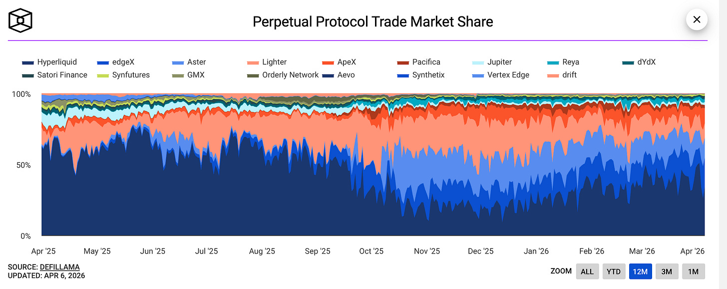 Within the perpetual DEX landscape, Hyperliquid continues to dominate the market at ~40%. The next four largest venues are evenly distributed at ~10% market share.