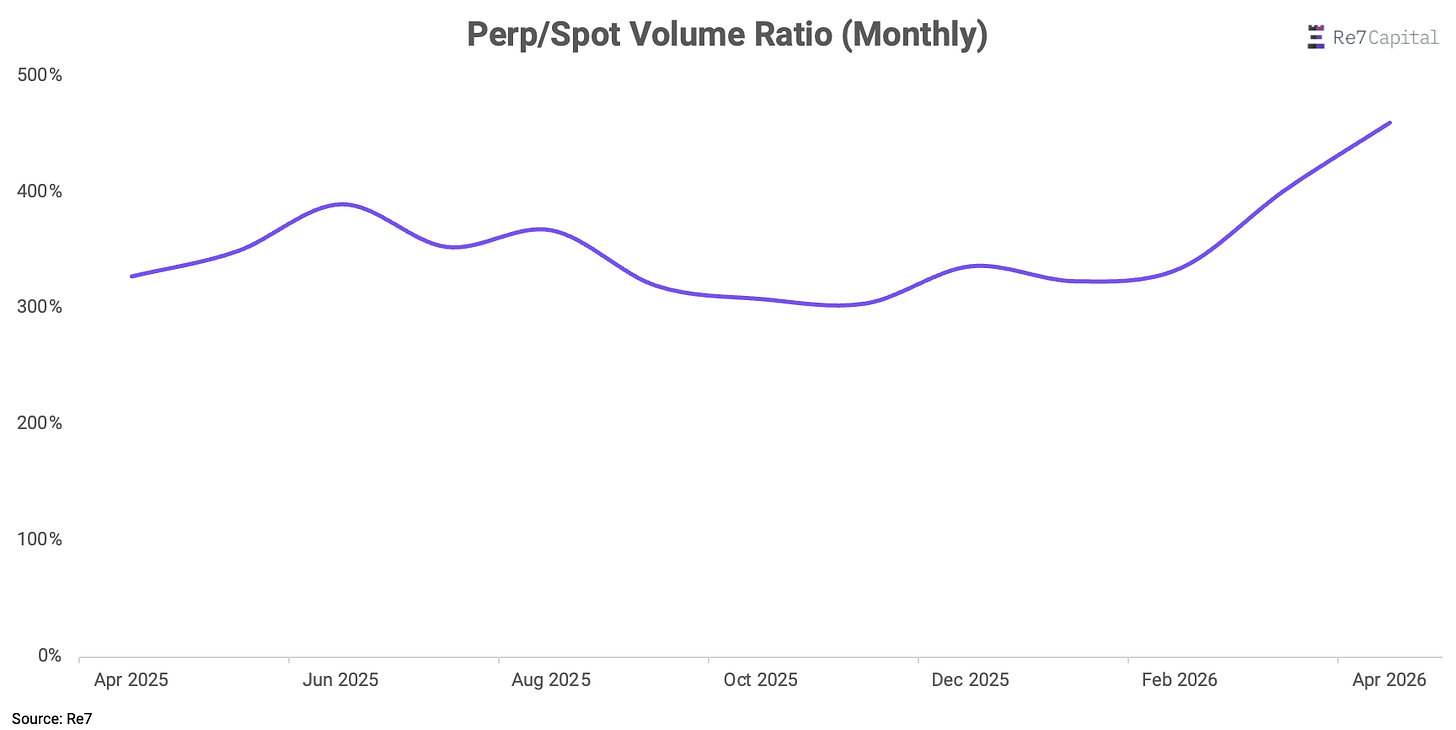 Perp/spot monthly volume ratio is at all-time-high where perp volume is 4.6x that of spot ($3.5T+).