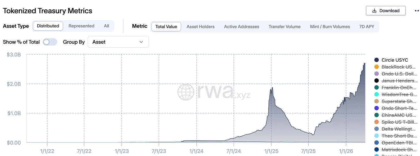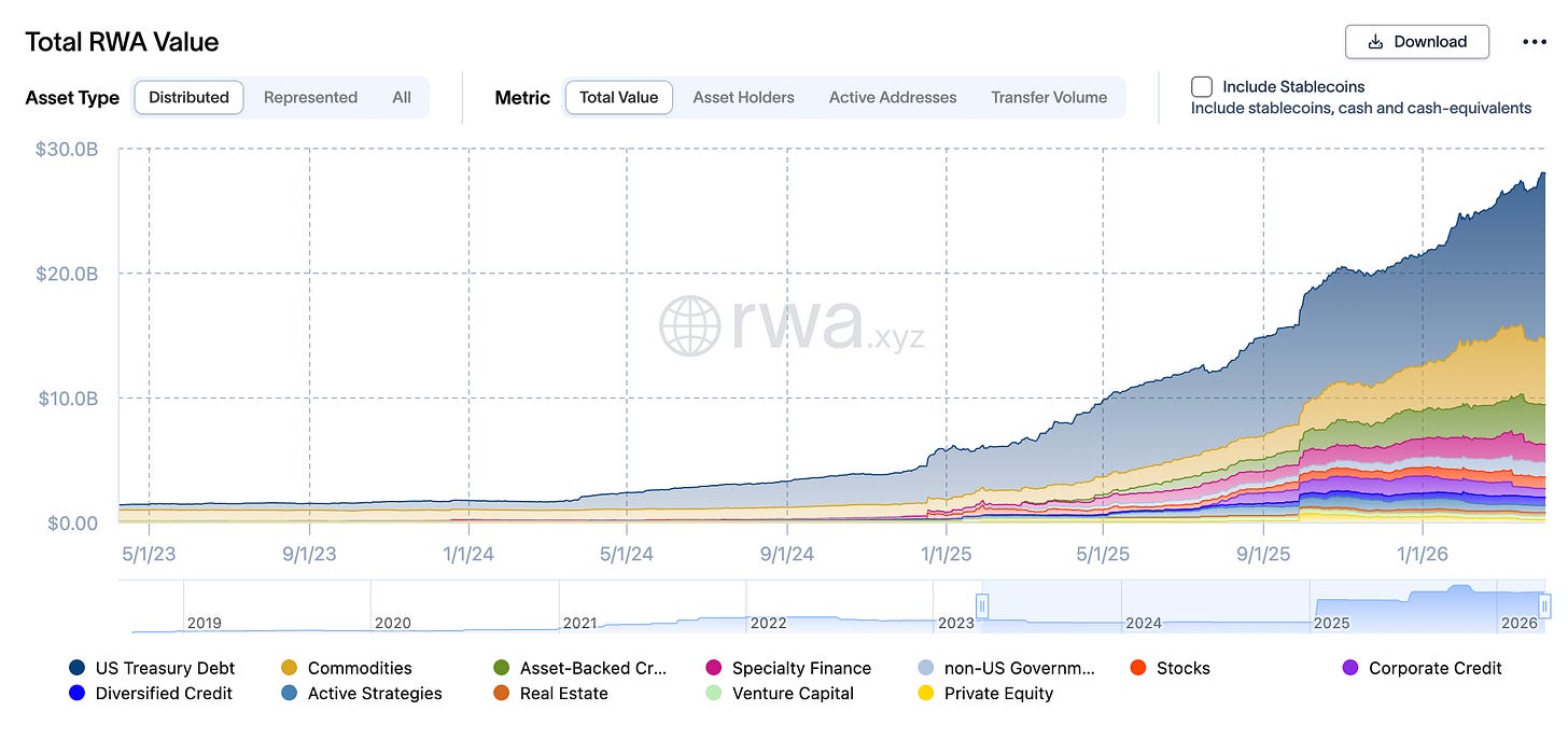 Tokenised real-world asset value has surpassed $28B where the most consistent growth in the last month has been from US treasury debt.