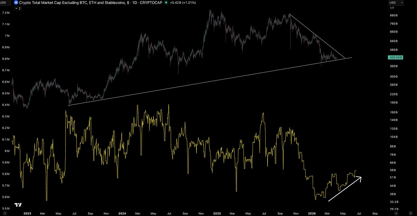 At the same time, US domestic liquidity conditions continue to improve as the business cycle progresses. Against that backdrop, total altcoin market capitalisation is currently holding at a key support level — being buoyed by liquidity undercurrents.