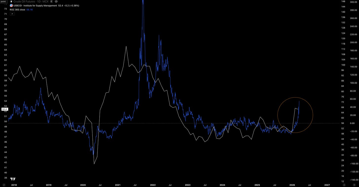 US ISM (white) vs. Crude Oil 365D 1Y% Change (blue).