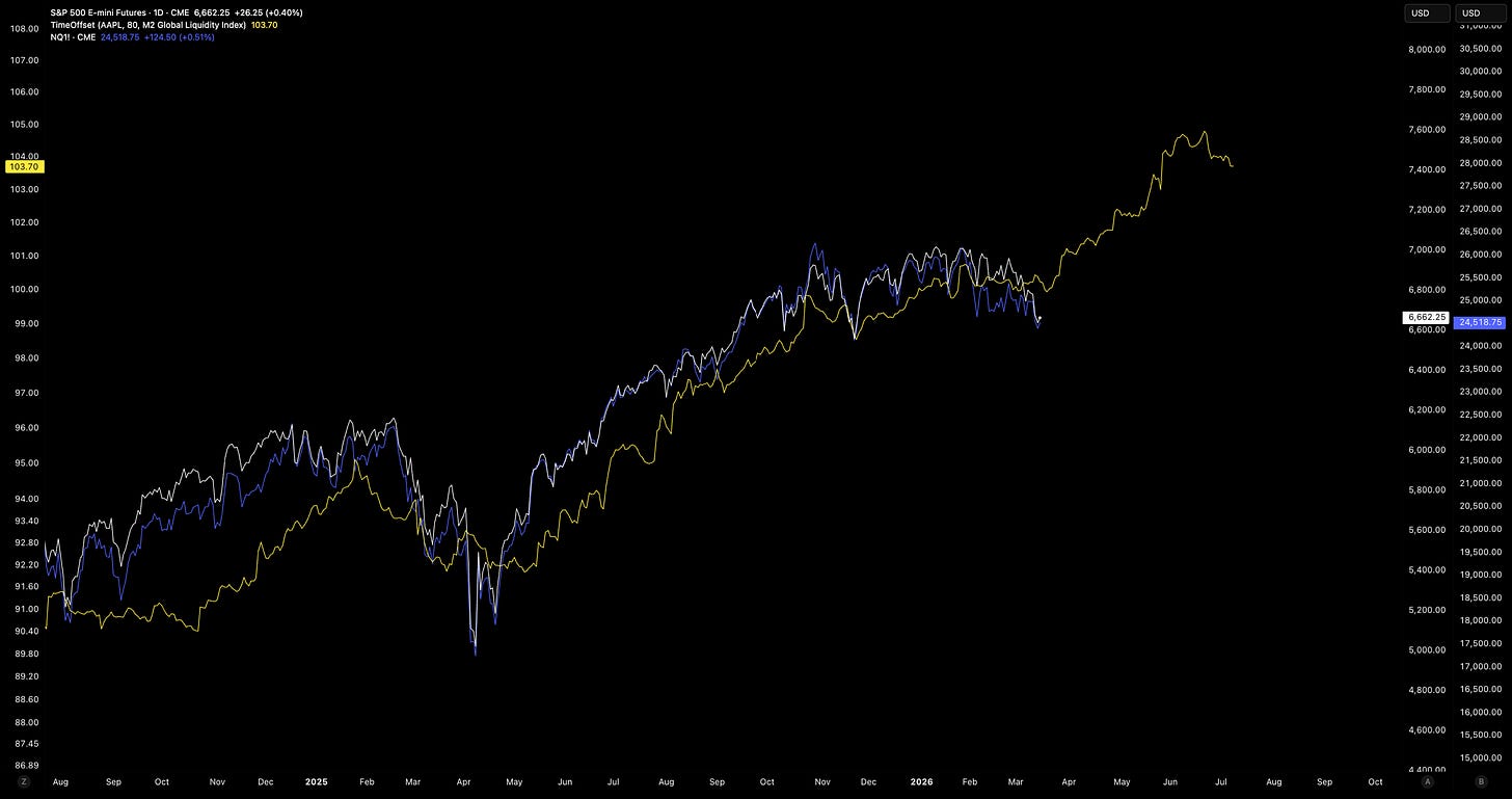 SPX (white) and QQQ futures (blue) vs. global net liquidity (yellow).