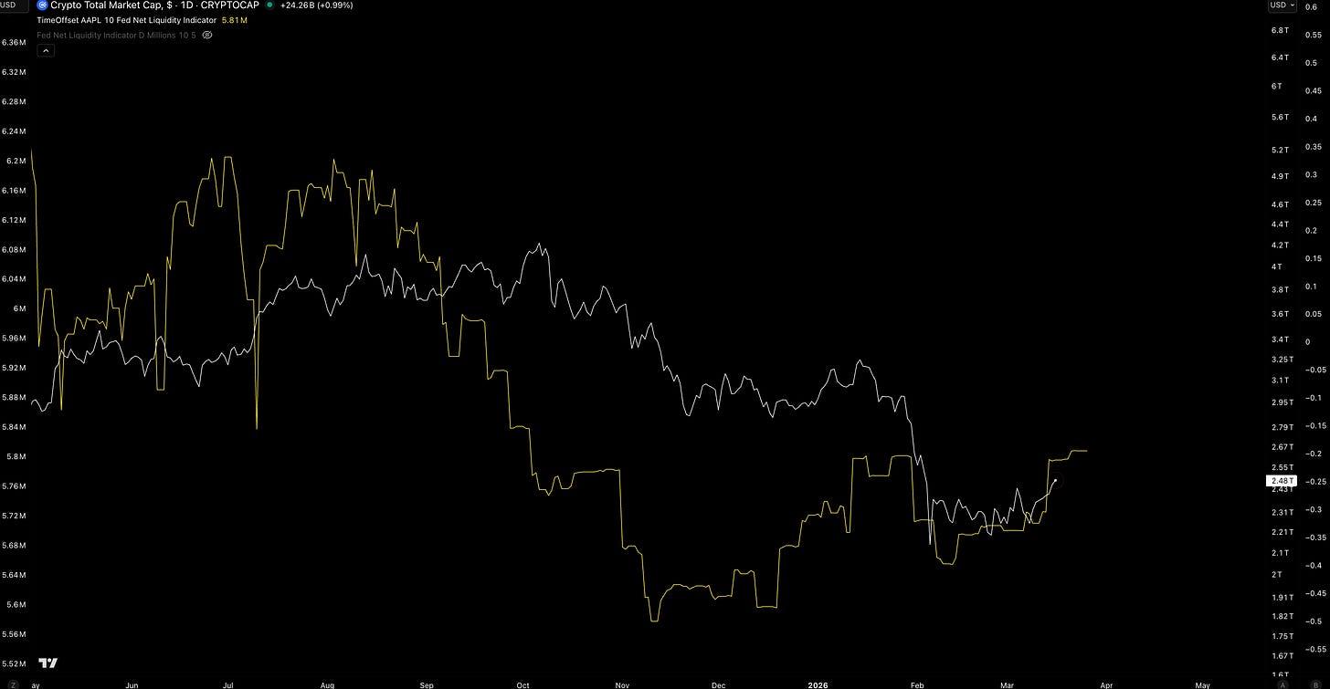 Unless the conflict materially escalates, the current alignment of sentiment extremes, recovering liquidity and seasonal patterns points toward potential near-term relief across risk assets.