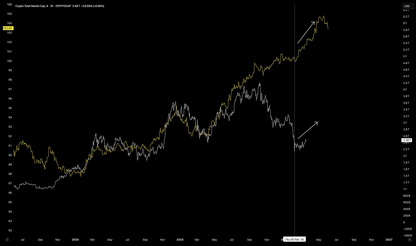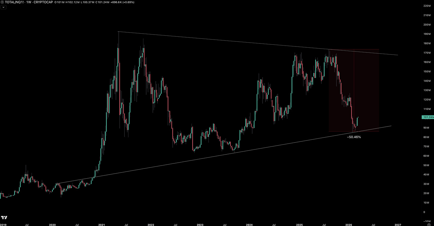Crypto markets have outperformed NASDAQ by +16% since the invasion after reaching 6 year support and declining >50% from its 2025 peak…