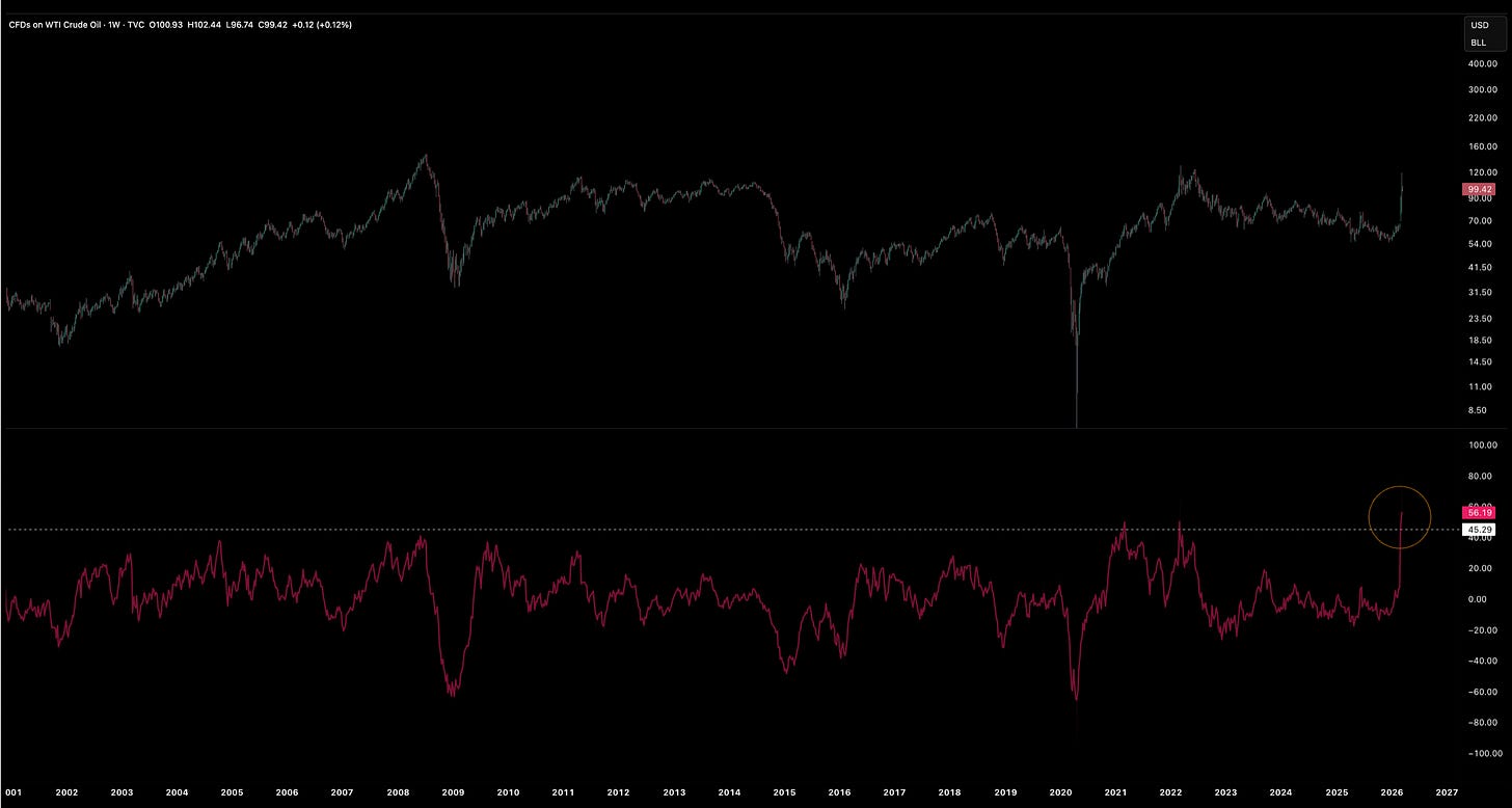 Oil has spiked toward the 100–120 dollars per barrel range on Middle East tensions, pushing technicals to rare extremes, while crowded downside positioning in equities and “extreme fear” in crypto contrast with how resilient Bitcoin and digital assets have been versus the Nasdaq and gold, leaving sentiment far more pessimistic than what current cycle dynamics, liquidity trends, and seasonality would normally imply for risk assets.