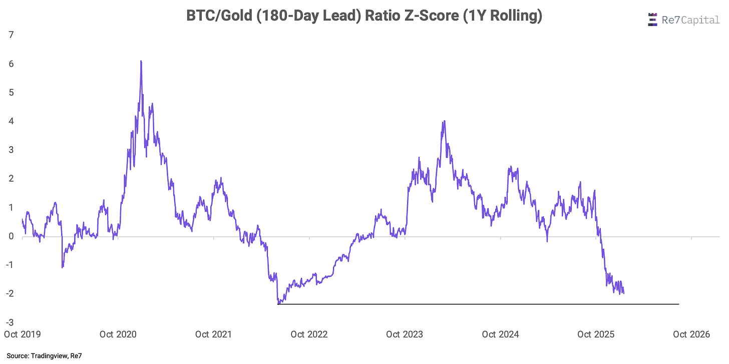 On a 180-day lead basis, BTC is trading at its cheapest level relative to gold since July 2022—a period that coincided with cycle lows across several assets, including ETH.