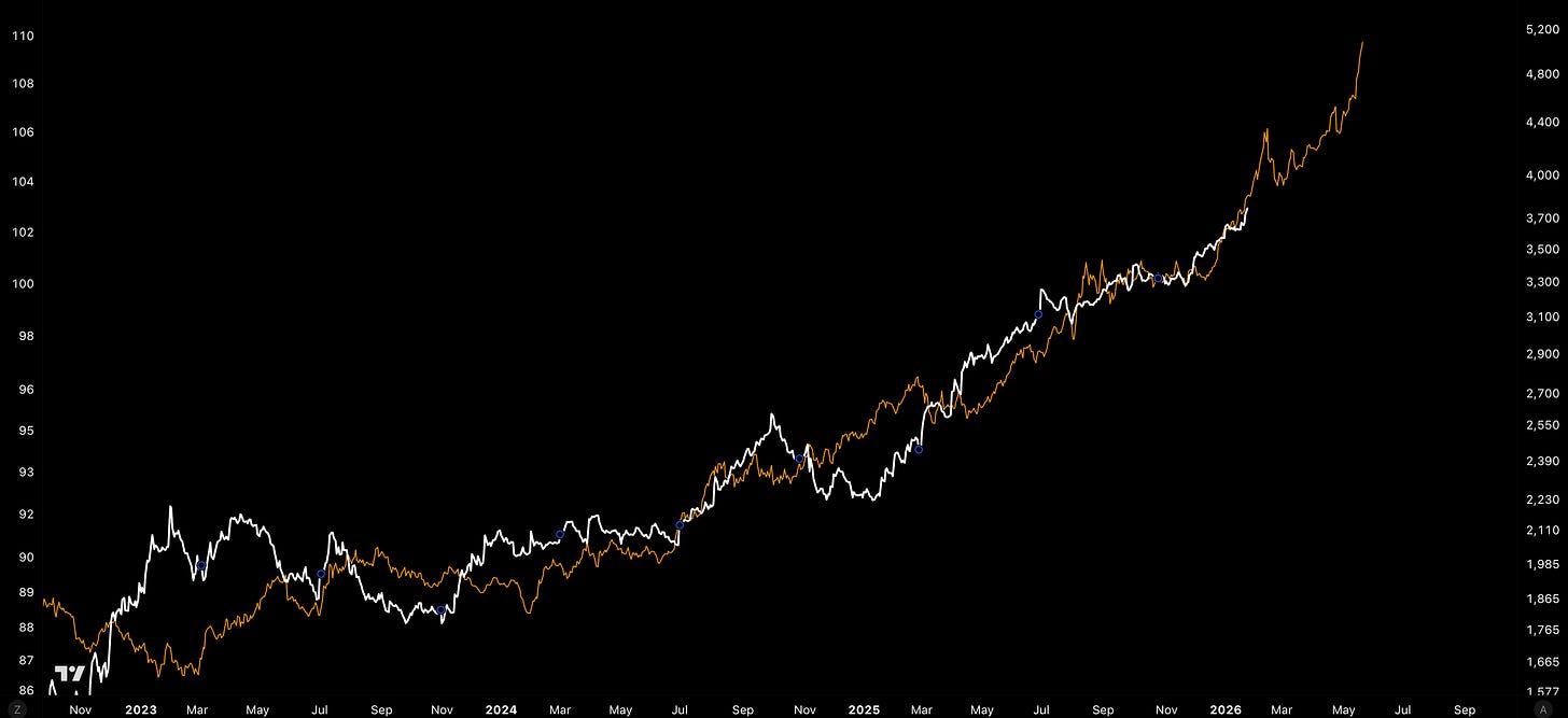 Elsewhere, Gold (orange) continues to blast through previous ATHs ($5,090), sending a clear signal of the liquidity and currency debasement on track over the coming quarters.