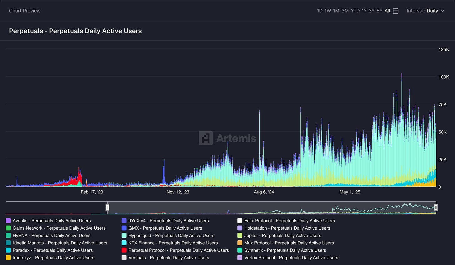 Perpetual DEXs now see 50-75k daily active users, up ~2x in 12 months. The attractiveness of 24/7 trading platforms is making legacy exchanges want to launch their own 24/7 stock trading platforms.
