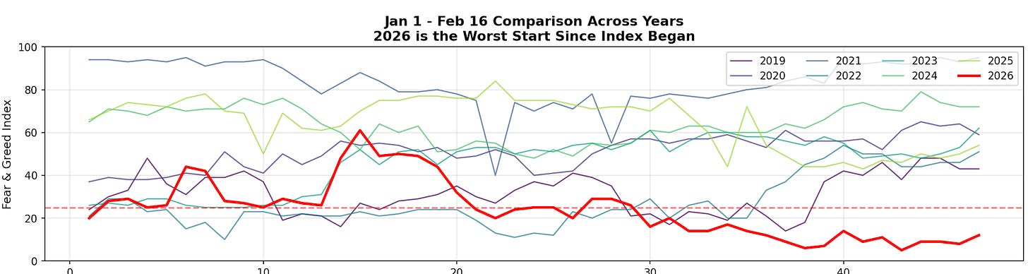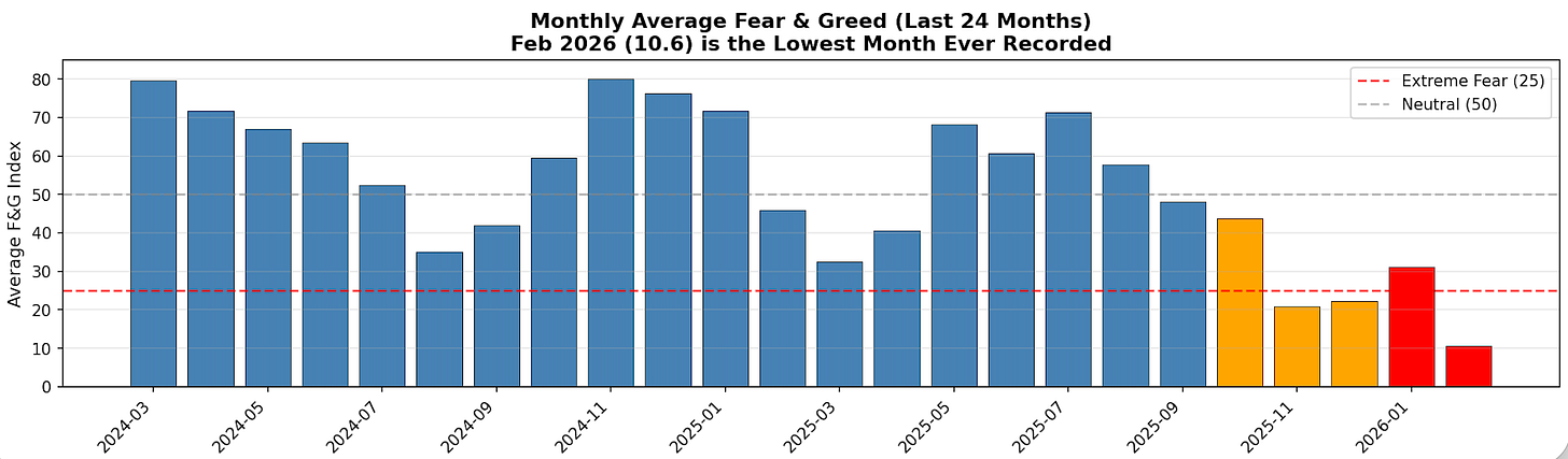 And the average sentiment score for Feb 2026 is (so far) the lowest month ever recorded in the history of the index (10.6), surpassing the FTX collapse, Terra/Luna collapse, and March covid crash by meaningful margins.