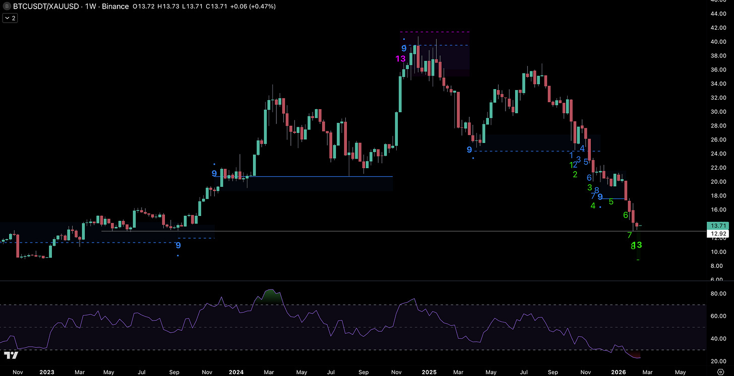 As crypto markets could now be in a bottoming process, we’re watching crypto’s ability to outperform precious metals. The BTC/Gold ratio has put in deMark ‘count 13’ (green) on the weekly timeframe indicating strong seller exhaustion. These more rare counts can help identify local bottoms.